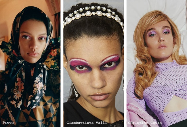 Desde Giambattista Valli jugando con violetas y lilas para las sombras de ojos de sus modelos hasta Jamal Scott aportando un toque de euforia con pedrería añadida a la sombra de ojos lila. No hace falta ir tan lejos y puedes seguir el ejemplo de Versace, donde la sombra de ojos es más suave.