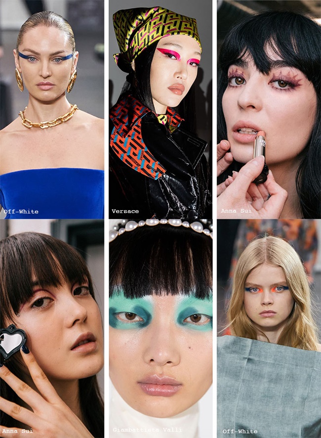 En Anna Sui, Pat McGrath ha optado por un estilo de maquillaje mod con líneas gruesas y detalles abstractos. Versace prefiere una sombra de ojos monocromática, colorida y con alas. Y N21 se ha querido hacer eco de las alas de Versace, pero cambiando los colores por un negro tinta.