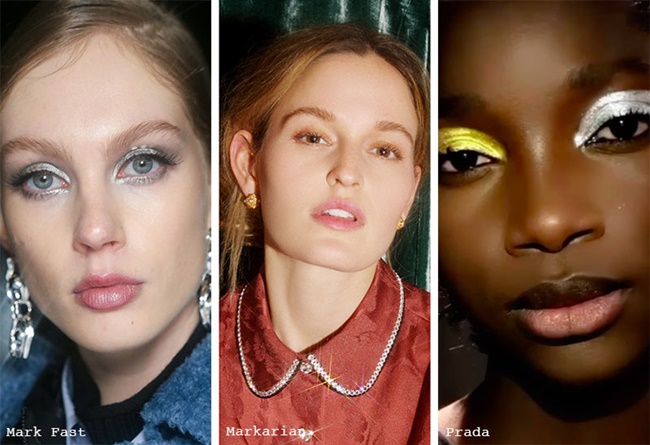 Parece que todo lo que brilla se ha vuelto muy popular esta temporada, y la sombra de ojos no se ha quedado atr´ás. El maquillaje de Pat McGrath para Prada es una fusión entre lo masculino y lo femenino, inspirado en la idea del cambio, donde ha combinado sombras de ojos metálicas con bonitos pasteles. Gianvito Rossi también ha seguido su ejemplo jugando con una sombra de ojos metálica brillante.