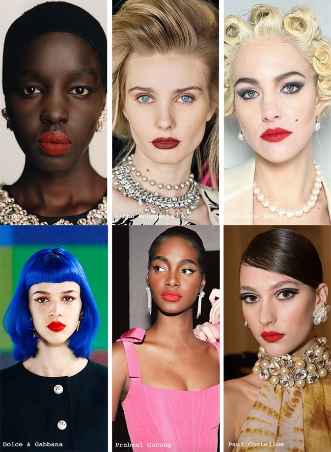 Al igual que las uñas rojas este invierno, el maquillaje de labios rouge se sigue imponiendo. Sandy Liang ha optado por contrastes en rojo ciruela jugando con la piel pálida, y J onathan Simkhai, Dries Van Noten y Prabal Gurung han optado por rojos rubíes profundos al maquillar los labios de sus modelos.